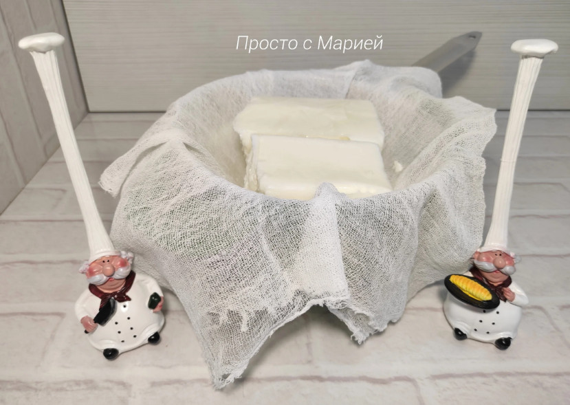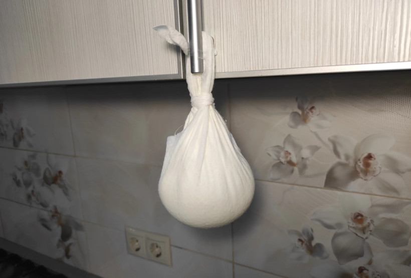 Когда заготовки немного подтают, собираем концы марли и подвешиваем кефирную массу, чтобы вся лишняя жидкость (сыворотка) стекла.
