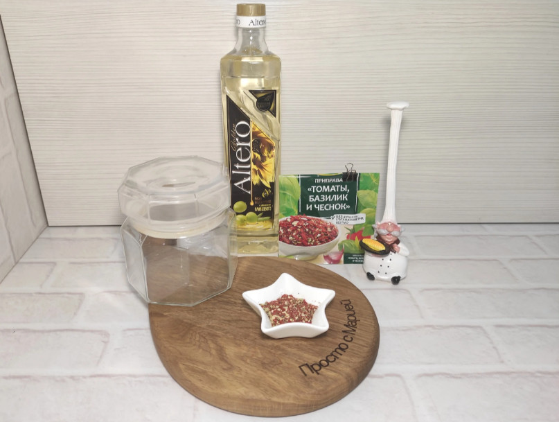 Берём чистую сухую ёмкость, выливаем в неё растительное масло и специи.