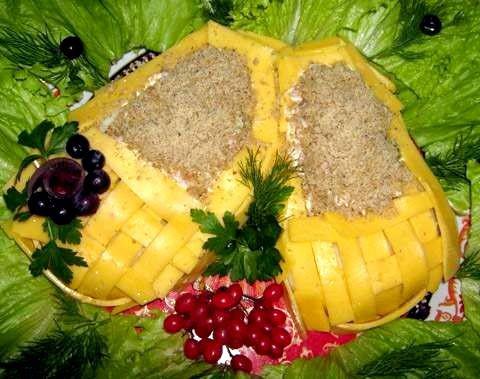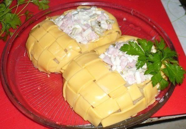 Если вы планируете застолье, можно приготовить вкусный салат с сыром и ветчиной. Причем, подать его можно очень оригинально – в форме лаптей. Это непременно вызовет восторг у ваших гостей! Готовится этот салат несложно. Его основу составляет картофельное пюре.