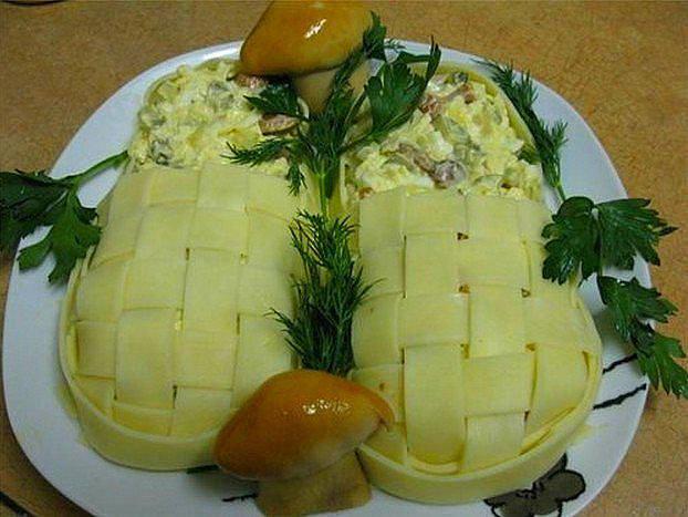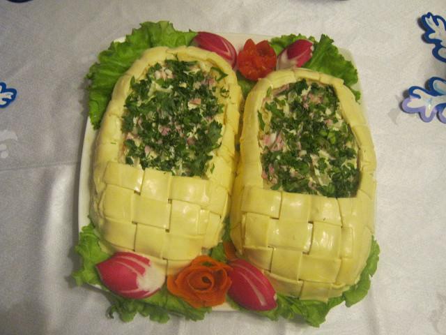 В принципе, в этом салате может быть любая начинка, так как эффект создают именно лапти!