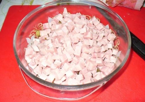Ветчину также измельчаем и кладем к огурчикам.