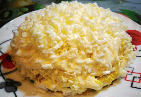 4.Тереть каждый слой продуктов нужно на весу над тарелкой ( или плоским блюдом), чтобы салат вышел действительно воздушным и нежным.