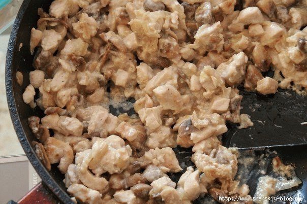 1. Мелко нарезаем курочку, грибы и лук, обжариваем их до готовности с использованием растительного масла, солим, перчим, добавляем сметану, доводим до кипения. Снимаем с огня.