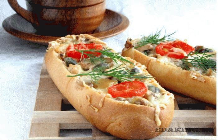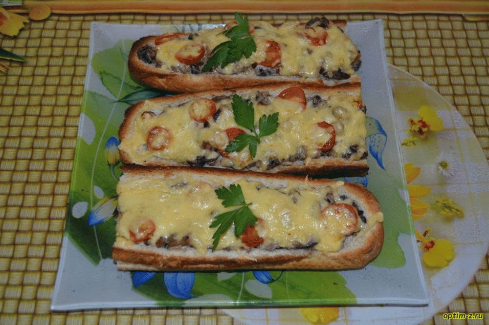 4. Посыпаем багет сыром, натёртым на крупной тёрке. Украшаем дольками помидоров, зеленью, грибочками и отправляем в духовку запекаться при 200 градусах минут 20.