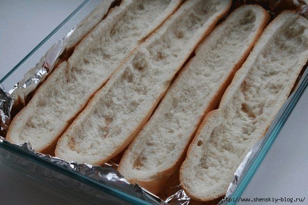 2. Багет разрезаем пополам вдоль, вынимаем из него мякиш.