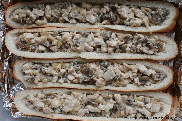 Простая и вкусная закуска: багет, фаршированный курицей и грибами!