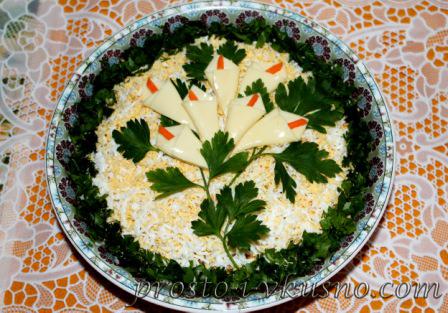 Третий слой — сваренные яйца натираем на крупную терку (можно мелко порезать кубиками). Смазываем слой майонезом. Нарезаем консервированные ананасы мелкими кубиками, выкладываем на яичный слой и смазываем майонезом. Последний слой — сыр, протертый на средней терке.