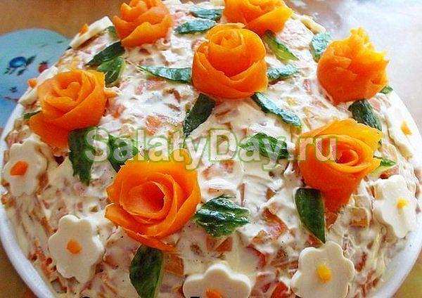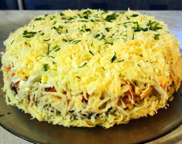Салат выкладывается слоями : картофель, потом грибы, майонезная сетка, курица кусочками, лук, морковь, майонез, яйца, сыр, майонезная сетка.