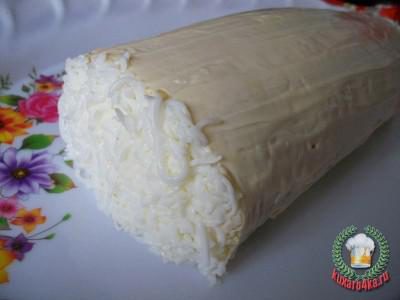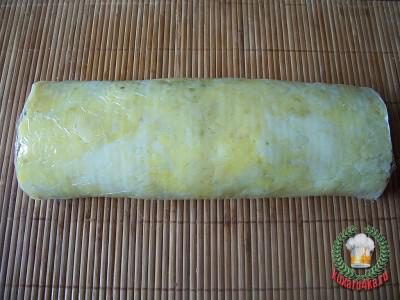Аккуратно свернуть в рулет и завернуть в один слой пищевой пленки (пленка помогает сворачивать, когда сворачиваете — пленку отодвигаете, а потом рулет заворачиваете этой пленкой на один оборот, чтобы форма держалась, а после того как постоит в холодильнике снимаете) . Поставить в холодильник.