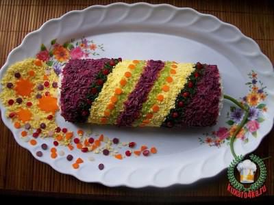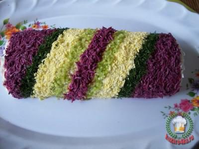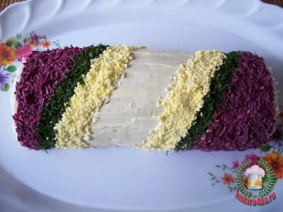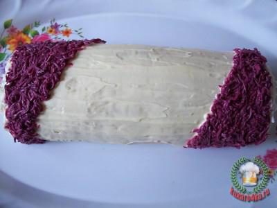 Достать, освободить от пленки, уложить швом вниз на блюдо и смазать со всех сторон майонезом. Оставшиеся яйца разделить белки от желтков. Белки потереть на терке и половину залить соком свеклы для окрашивания в розовый цвет. Дать постоять минут 15 и отбросить на сито, чтобы стекла жидкость. Другой половиной белков присыпать бока хлопушки.