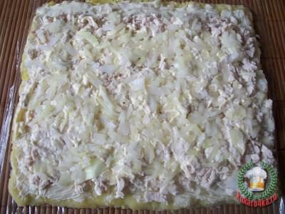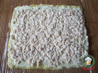 Сверху, отступая от одного края, выложить порезанное на мелкие кусочки отварное куриное филе, посолить и полить майонезом.