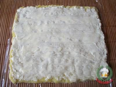 На пищевую пленку выложить, отваренный в мундире картофель, потертый на терке, в виде прямоугольника. Хорошо утрамбовать, посолить и смазать майонезом.