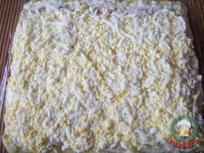 Следующий слой — потертые на мелкой терке яйца и смазать майонезом.
