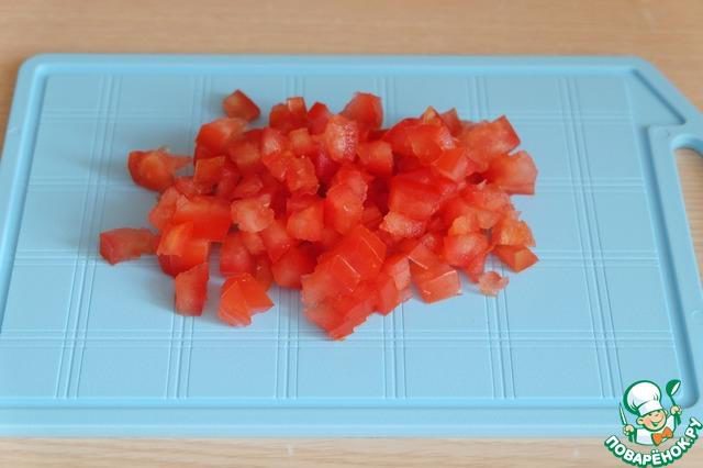Из помидора удалить семена лишнюю влагу. Помидорную чашечку порезать мелкими кубиками.