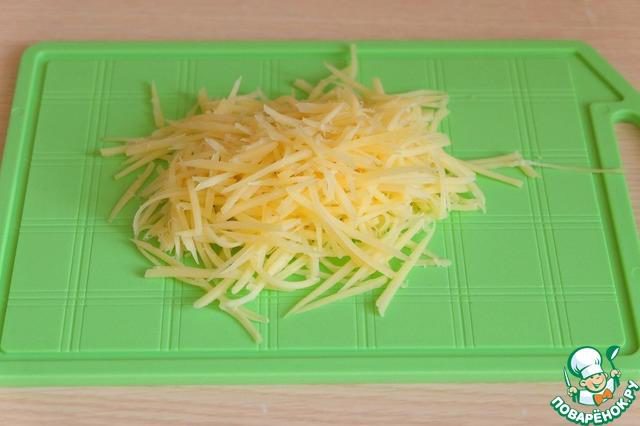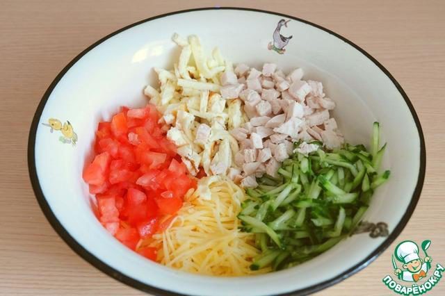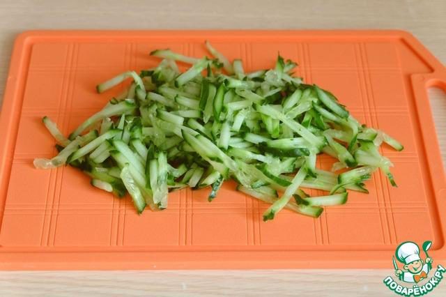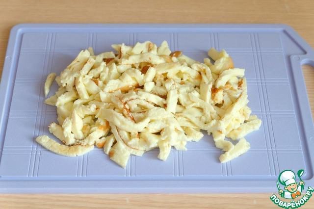 Яйцо взбить, добавить требуемое количество молока, к смеси добавить соль по вкусу, испечь омлетный блин. Омлет остудить, порезать соломкой.