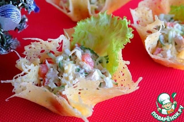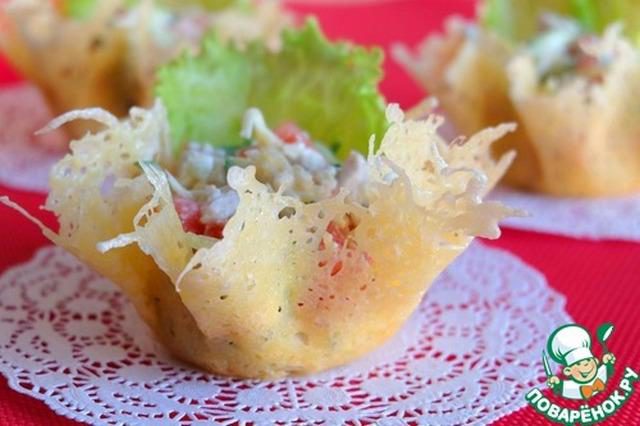 Довольно простой в приготовлении, но в то же время оригинальный салат - "Сырная фантазия" будет выглядеть очень оригинально и презентабельно, если подать его в сырных корзиночках.