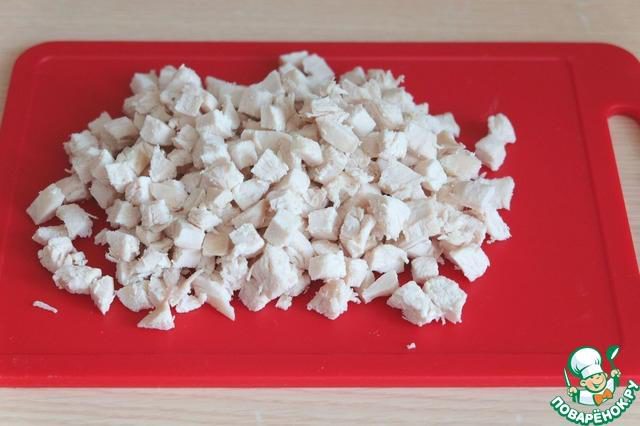 Куриное филе отварить в подсоленной воде. Остудить. Порезать мелкими кубиками.