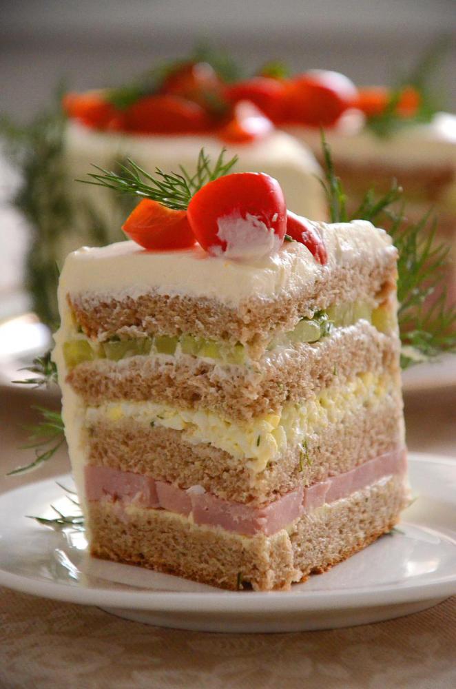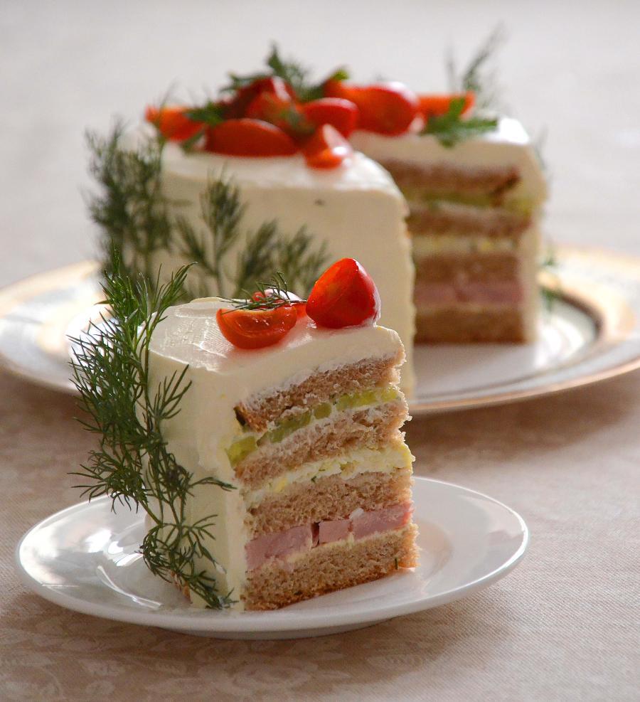Сегодня у нас эксперименты с обычным бутербродом, который в итоге превратился в торт. За основу была взята идея скандинавского закусочного торта. Также он называется сэндвич-торт, бутербродный торт. Как правило, в составе у них рыба. А у меня бюджетный вариант - с ветчиной!