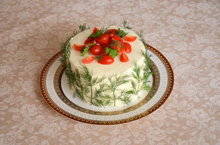Не забывайте солить и посыпать укропом. Оставшимся кремом обмазать торт, украсить помидорами и петрушкой.