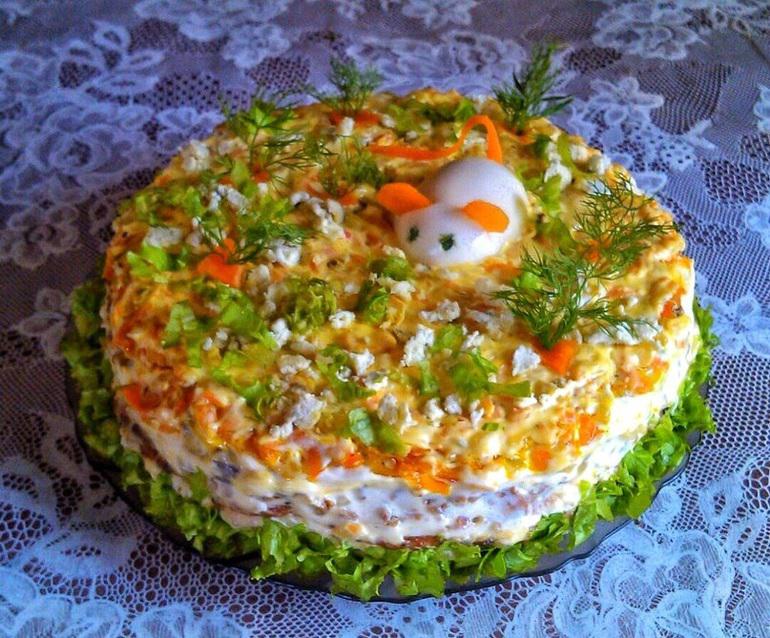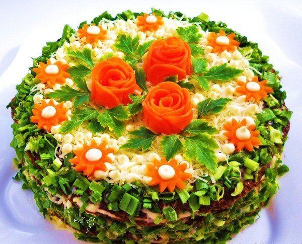 Украсить торт можно с помощью зелени, розочками из помидоров или вареной моркови, но если торт приготовлен не на праздник, а для семейного ужина, то легче всего украсить его просто натертыми на средней терке белком и желтком.