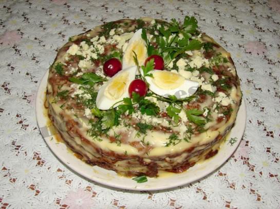 Сегодня я хочу предложить вам рецепт, который подойдет и для праздничного стола и, например, к обеду или ужину выходного дня – это блюдо недорогое, сытное, а, главное, вкусное. Итак, сегодня для вас рецепт печёночного торта с фото пошагово.