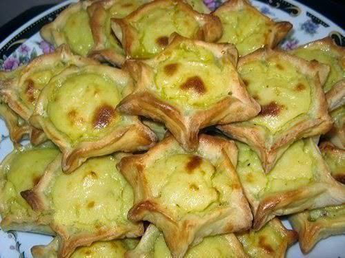 5. Готовую картофельную массу положите в приготовленные из теста формочки, бока смажьте яйцом со сметаной и запекайте шаньги в духовке при 250 градусах до золотистого цвета.
