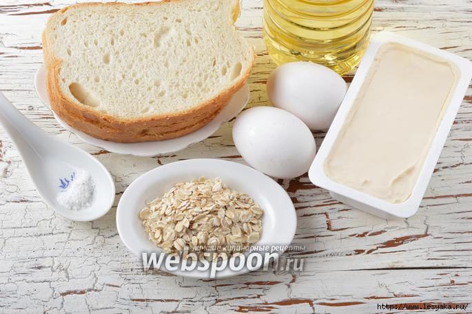 Для работы нам понадобится белый хлеб, яйца, соль, подсолнечное масло, мягкий плавленный сыр (в ванночке), овсяные хлопья.