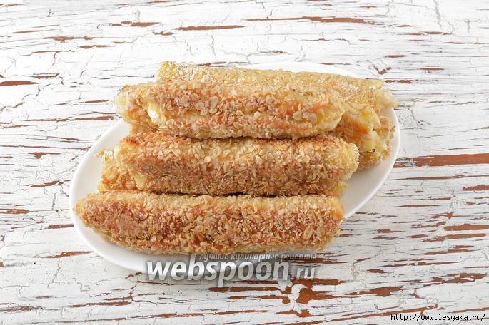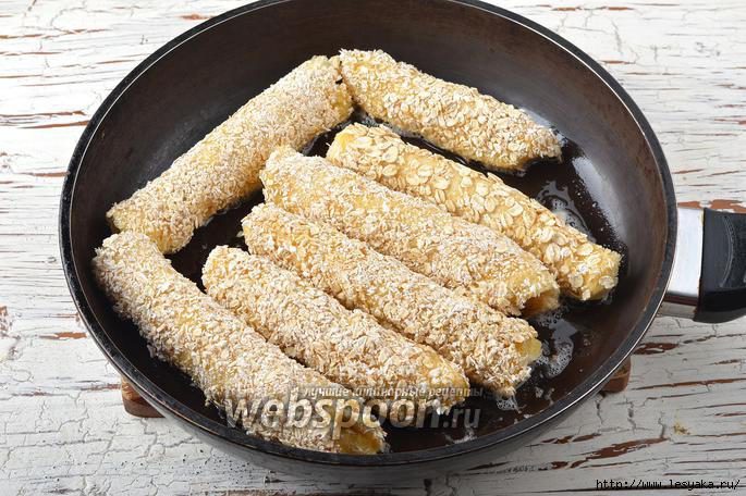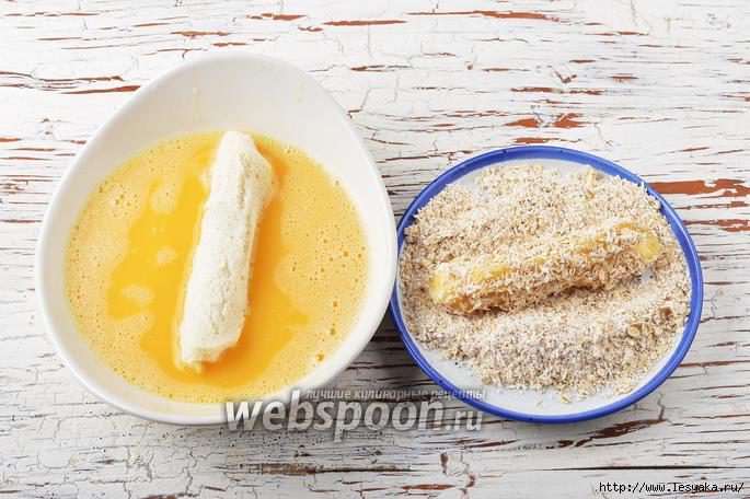 Каждый хлебный рулет обмакнуть со всех сторон в яйце, а затем обвалять в хлопьях.