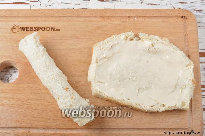 Смазать каждый ломтик хлеба мягким плавленным сыром (100 г) и скрутить рулетиком.