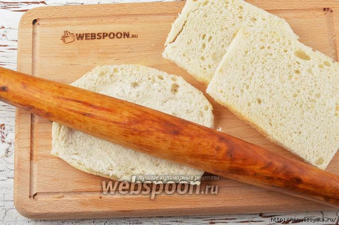 Раскатать каждый ломтик хлеба скалкой.