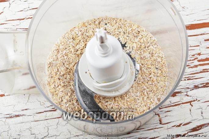 Овсяные хлопья (1 стакан) поместить в чашу кухонного комбайна (насадка металлический нож) и измельчить до состояния средней крошки.