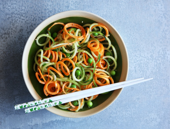 - При помощи слайдера нарезаем в тарелку с заправкой огурцы длинными тонкими полосками, режем до семян с четырех сторон. Потом добавляем приготовленные листья кинзы, чили и посыпаем все кунжутом.