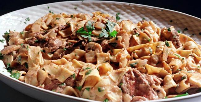 Бефстроганов из фарша с шампиньонами