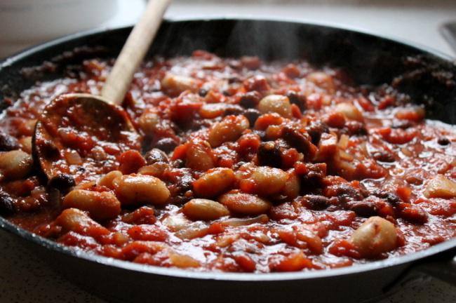 Обжарить фасоль и бекон на оливковом масле, затем добавить томатный соус, черный перец и соль (также можно добавить паприку и базилик). Тушить смесь несколько минут.