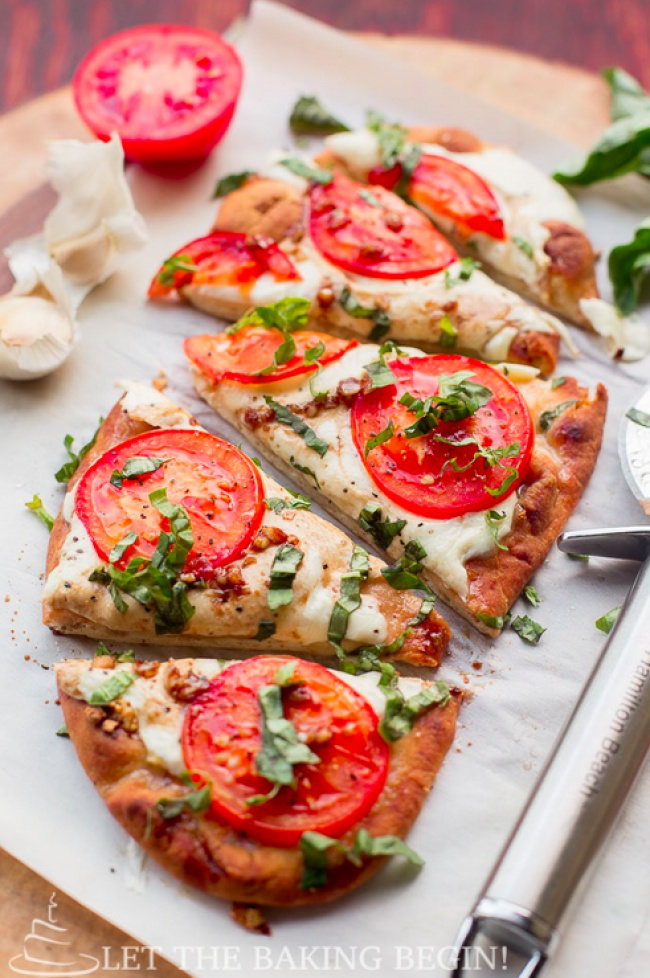 Чеснок раздавить, смешать с маслом. Смазать лепешки половиной смеси, поместить в разогретую до 180ºC духовку на 5 минут. Положить на лепешку порезанную моцареллу, посолить, поперчить. Тонко нарезать помидоры, положить на лаваш, посолить, поперчить. Поставить в духовку на 7 минут. Следить, чтобы лаваш не подгорел. Смешать оставшееся масло с бальзамическим уксусом. Нарезать листья базилика. Готовую пиццу сбрызнуть получившимся соусом, посыпать базиликом.