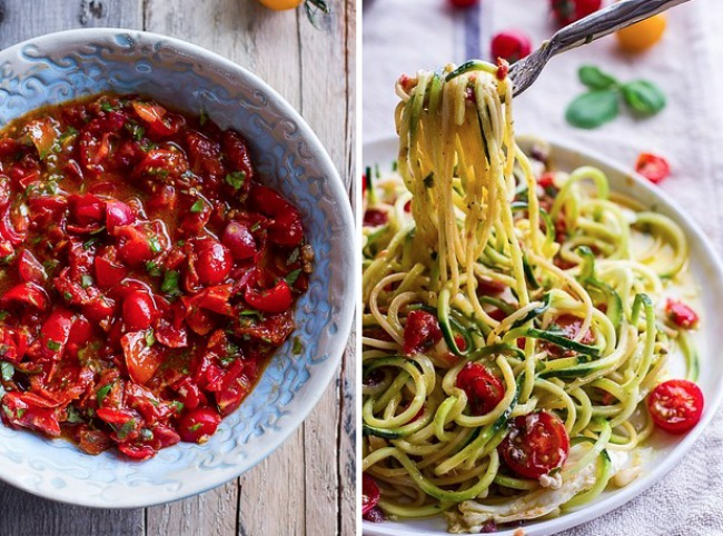 Паста с цукини, помидорами черри и соусом из базилика