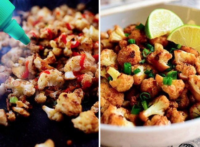Сковороду нагреть, добавить масло, цветную капусту и нарезанный чеснок. Жарить до золотистой корочки. Огонь уменьшить, добавить острый соус, сок лайма и большую часть лука. Готовить в течение 2 минут. Готовое блюдо посыпать оставшимся луком.