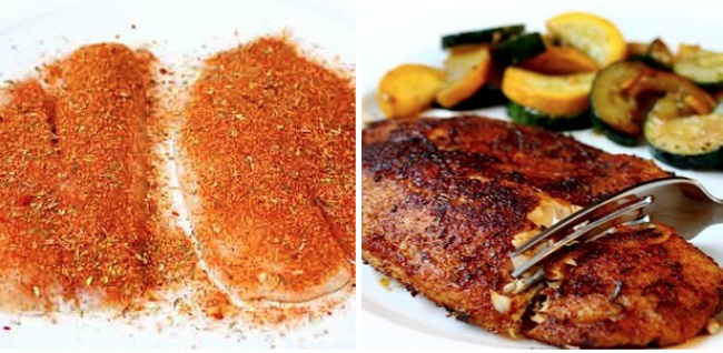 Смешать все специи. Натереть ими филе. Нагреть на сковороде масло. Поджарить рыбу с каждой стороны по 3 минуты.