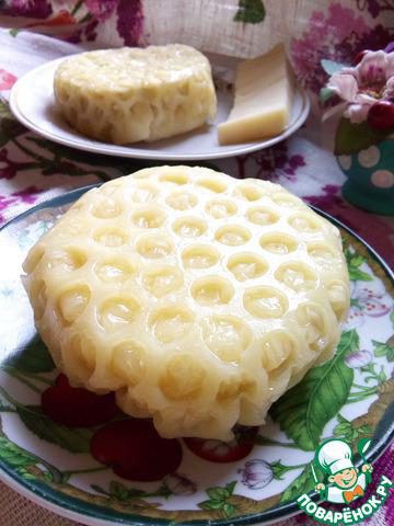 Для украшения пластинку сыра положить на пищевую плёнку и поставить в микроволновку на 15 секунд.