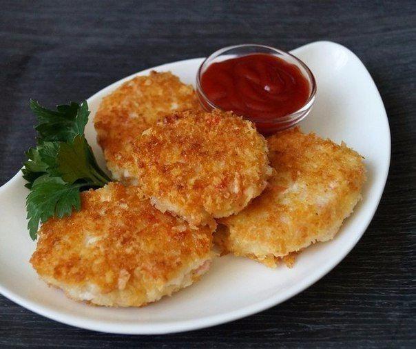 Очень вкусные как в горячем, так и в холодном виде, котлеты из крабовых палочек и сыра.