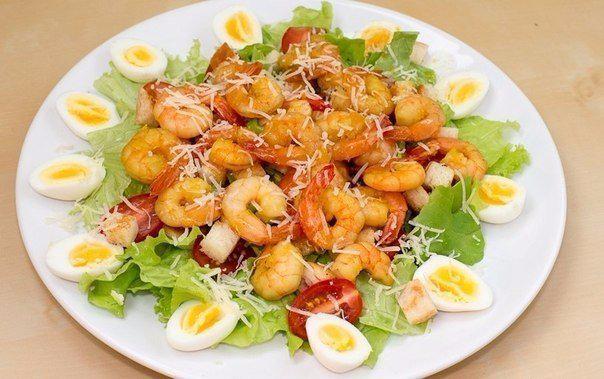 7) Салат с креветками, сухариками и яйцами