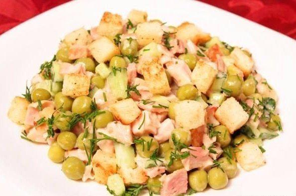 2) Салат с сухариками, горошком и копченым окорочком
