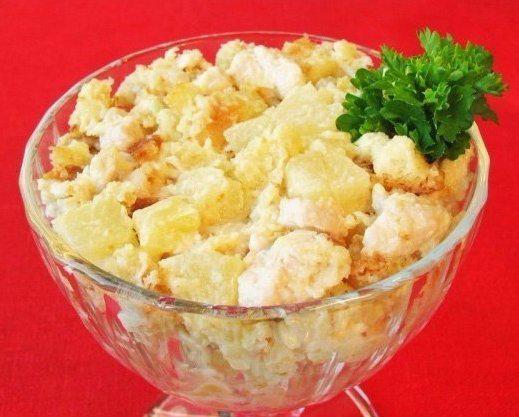 6) Салат с куриным филе, сухариками и ананасами