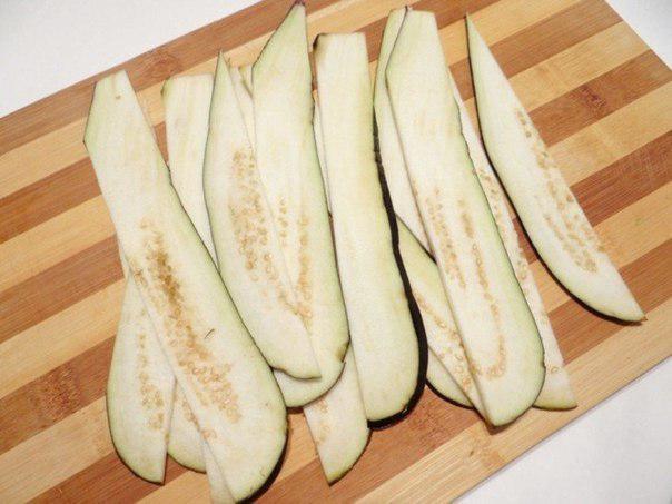 7. Ломтики баклажанов нарежьте на полосы шириной около 2 см.