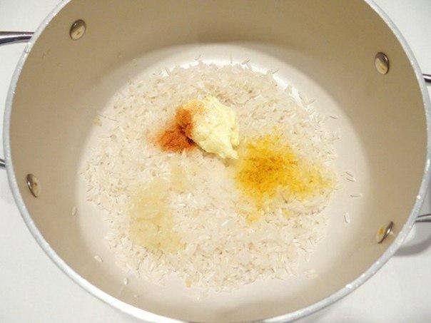 3. Поместите промытый рис в кастрюлю, добавьте соль, пропущенный через пресс чеснок, сливочное масло, куркуму и перец чили молотый.