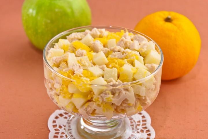 Салат с апельсином, курицей и сыром – палочка-выручалочка многих хозяюшек. Дело в том, что чаще всего праздничные столы переполнены тяжелыми, мясными салатами. Вот почему данное блюдо станет прекрасным разнообразием легкости и изысканности. Это блюдо получается невероятно нежным - такой эффект получается за счет прекрасного сочетания курицы и сыра. А за счет добавления апельсина, он получается свежим, ярким и запоминающимся