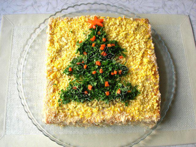 - Из зелени делаем елочку, украшаем отваренной морковью.