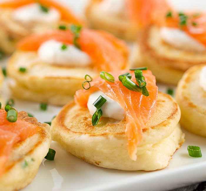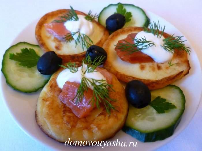 Необычная закуска для фуршета, которая явно придется по вкусу любителям выпечки. Испечем оладьи по обычному рецепту, дадим остыть и выложим на каждый экземпляр начинку. Закуска готова к подаче.