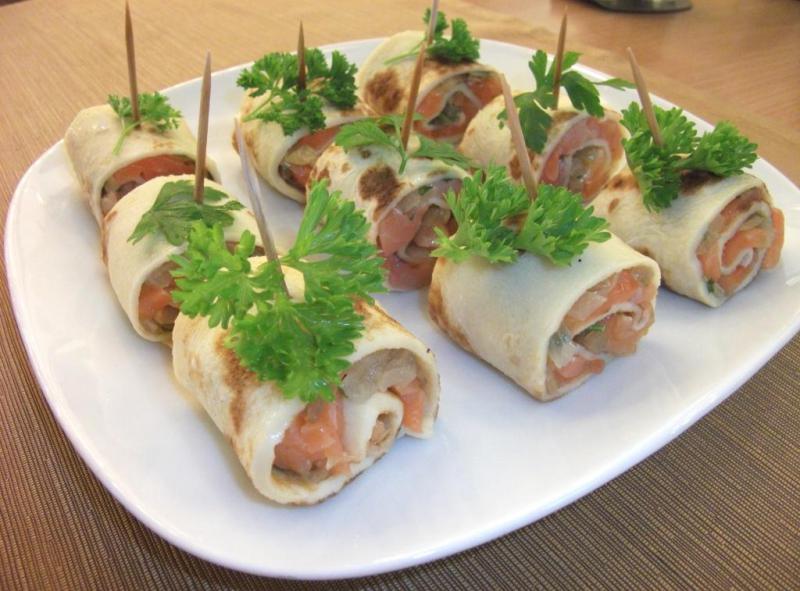 Это могут быть мясные или овощные рулеты из лаваша, ломтиков ветчины или блинчиков.