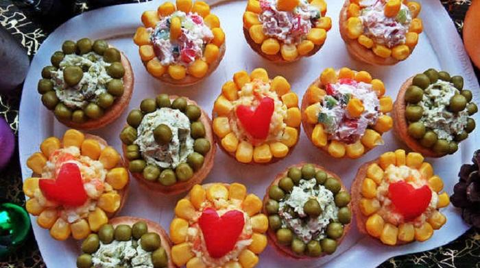 Корзиночки из теста можно начинить салатом, порезанной колбасой с сыром, творогом, крем-сыром и так далее. Такую закуску очень удобно кушать, а выглядит она просто превосходно.